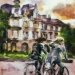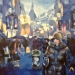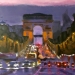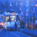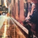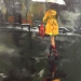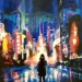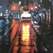 Een regenachtige dag. De avond begint te vallen. Verlichte etalages weerspiegelen op de natte straat. Een enkeling passeert met regens herm in de hand.